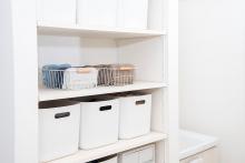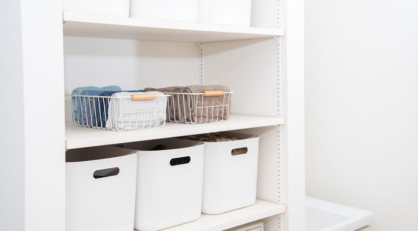 洗面台下収納の下段には洗剤ストックなどの重いモノを、手の届きにくい収納キャビネットの上段にはタオルストックなど使用頻度が低く軽いモノを収納します。洗面所は細かいモノが多く、忙しい時間に使うためモノが出しっぱなしになりやすい場所です。しかし、洗面ボウル周辺にモノを置きっぱなしにすると、水垢がついたり掃除がしにくくなったりするため、ゴールデンゾーンを特に意識してキレイをキープできるように挑戦してみましょう。